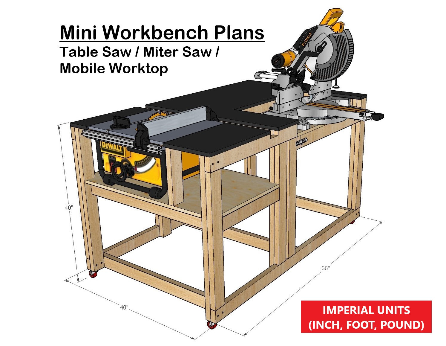 Compact Mobile Workbench Plans for Miter / Table Saw - Instant PDF Download - Imperial Units